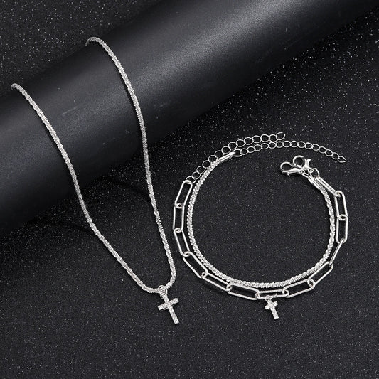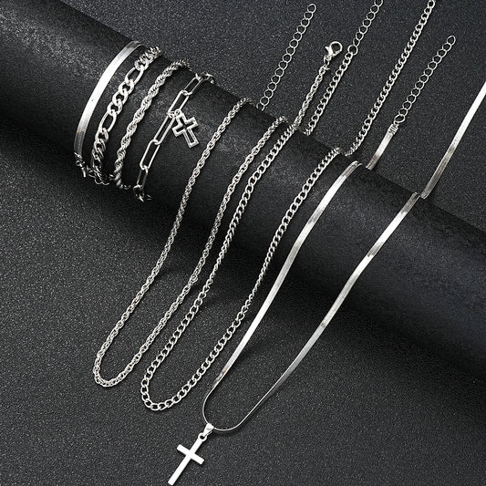 EDELSTAHL 3-IN-1 "SILVER CROSS" SCHMUCKSET (HALSKETTE + 2 ARMBAND)