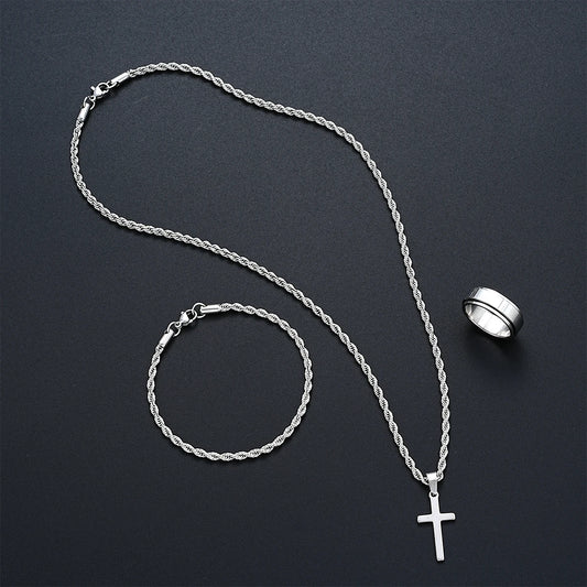 EDELSTAHL 4MM 3-IN-1 "SILVER ROPE CROSS" SCHMUCKSET (HALSKETTE + ARMBAND + RING)