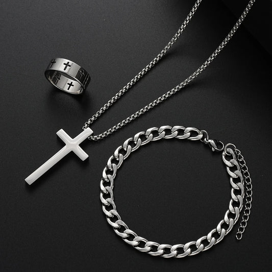 EDELSTAHL 3-IN-1 "SILVER CROSS" SCHMUCKSET (HALSKETTE + ARMBAND + RING)