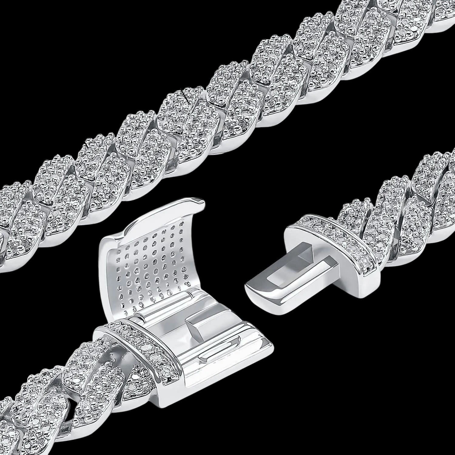 Die ICERAIN Silver Iced-Out Prong Cuban Kette überzeugt durch ihr markantes Design, ihre brillante Optik und ihre hochwertige Verarbeitung. Die präzise gefassten Zirkonia-Diamanten verleihen der Kette einen luxuriösen, eisigen Look, der bei jeder Bewegung beeindruckend funkelt.